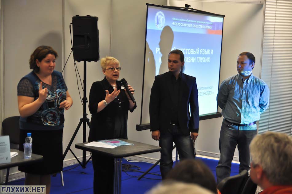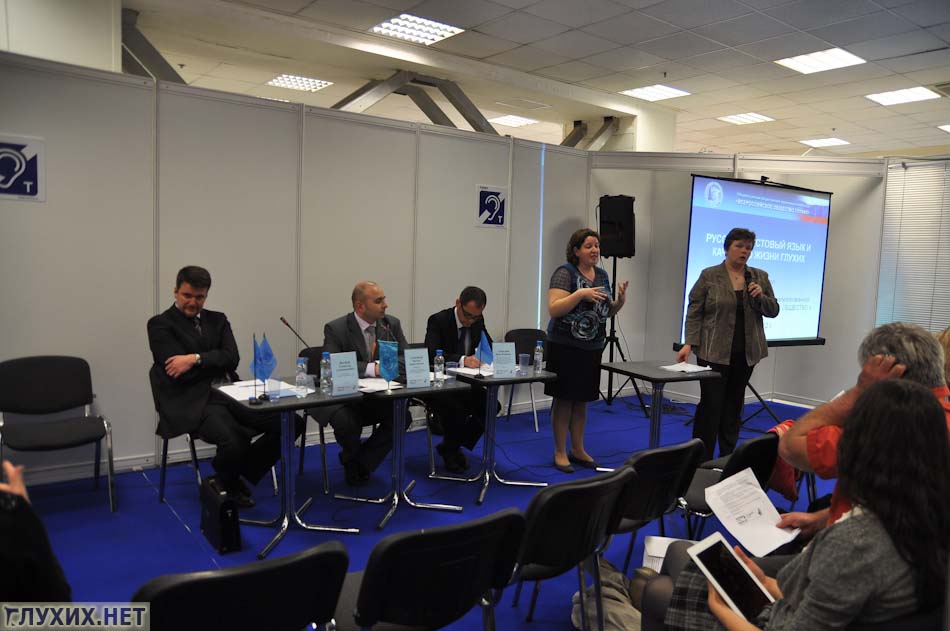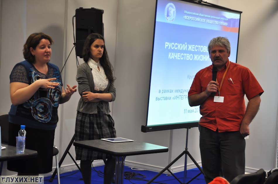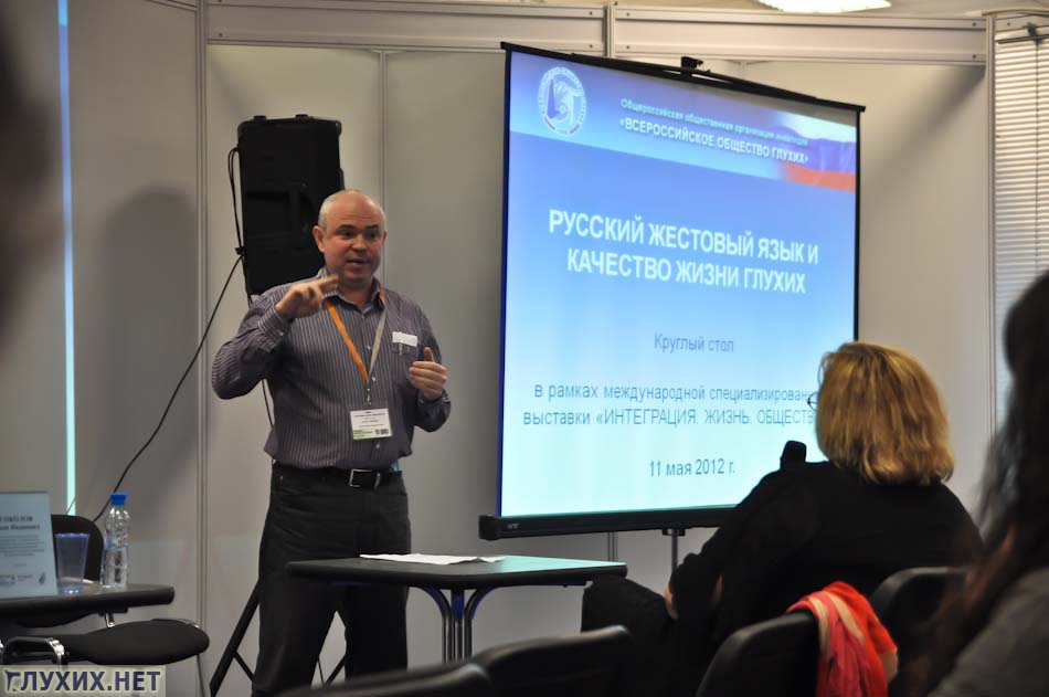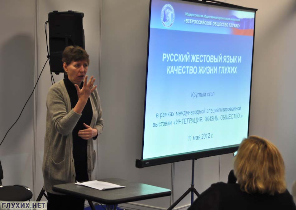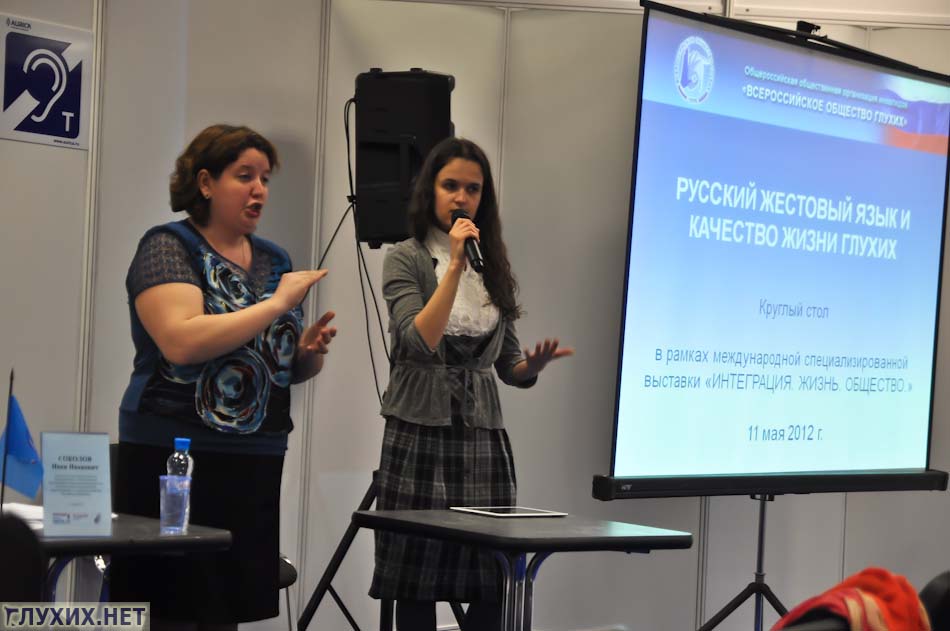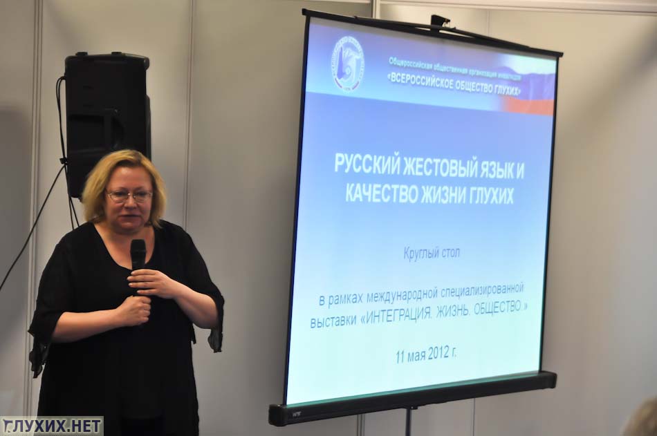 11 мая 2012 г в «Экспоцентре» в рамках международной выставки «Интеграция. Жизнь. Общество» состоялся круглый стол «Русский жестовый язык и качество жизни глухих». В рамках обсуждения были подняты вопросы и проблемы, касающиеся жестового языка в России.С приветственным словом выступил Иванов С. А., вице-президент ВОГ. Он озвучил важные законодательные изменения 2012 года: 25 апреля Россия ратифицировала Конвенцию о правах инвалидов, практическая реализация которой дает надежду на повышение качества жизни глухих, связанное с изменением статуса жестового языка.
