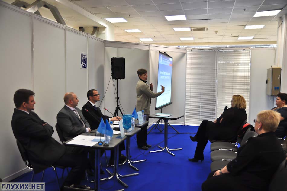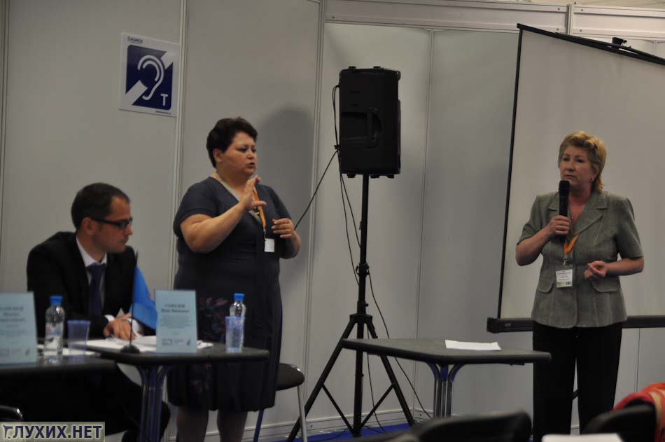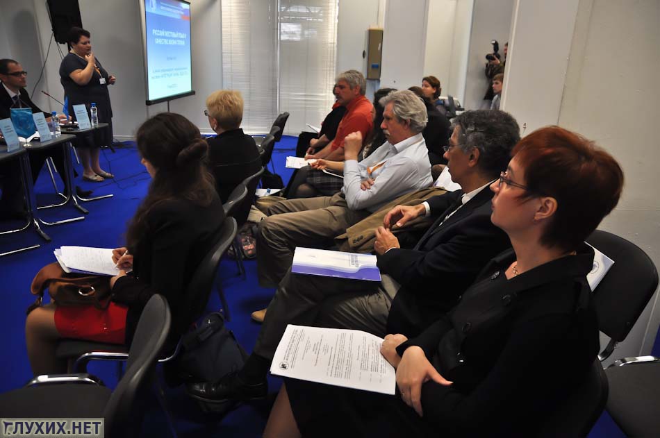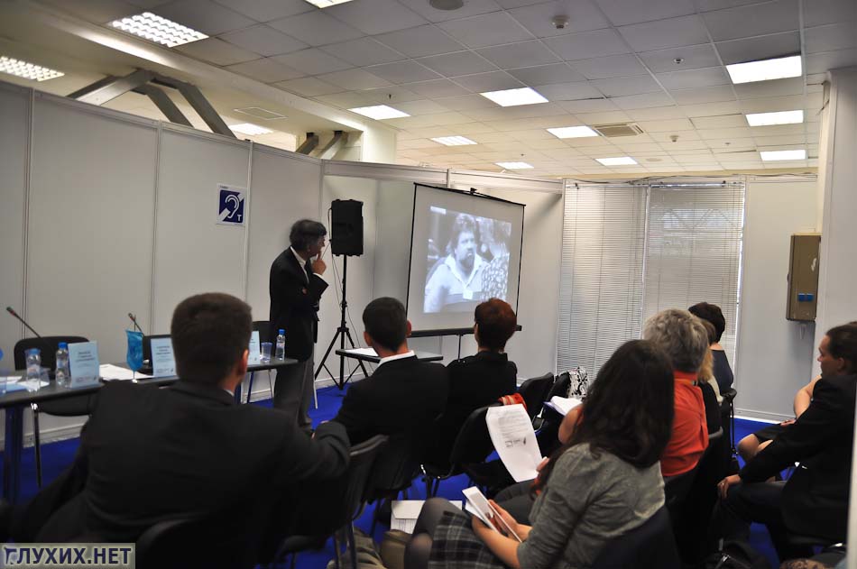 Первым с докладом «Русский жестовый язык и качество жизни глухих» выступил Ларионов М.Б.. Он обозначил основные проблемы: количество и качество переводчиков жестового языка (на данный момент в России существует нехватка 6000 переводчиков). И использование жестового языка в образовании, не принятие билингвистической системы. Отметил дефицит кадров в школе, связанный со снижением престижа профессии сурдопедагога, в связи с этим упало и качество образования, что сказывается на невозможности получения хорошей работы и снижении качества жизни глухих. А также в докладе была озвучена важность обеспечения права любому человеку с нарушением слуха поступать в образовательные учреждения по своему выбору.