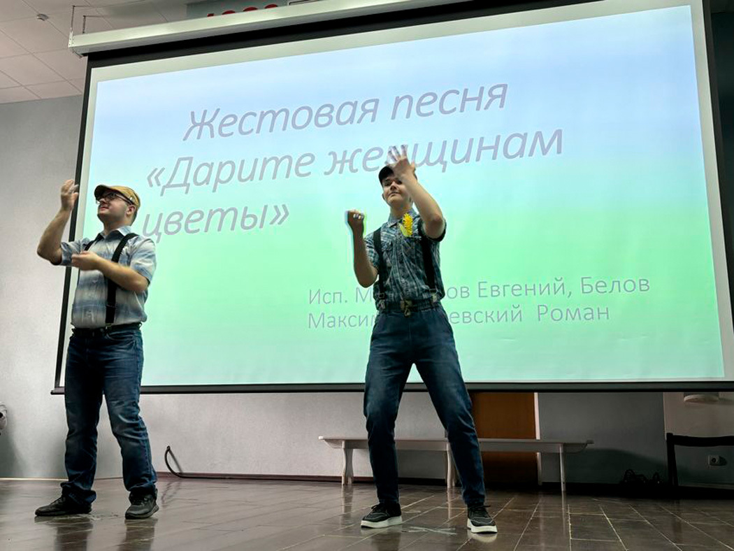 Гостей ждала насыщенная программа Фестиваля: жестовые песни («Россия», «Матушка», «Твой мир», «До свиданья, мальчики», «Дарите женщинам цветы», «Мы вместе» «Облаком по небу», «Иногда»), трогательные стихотворения, забавные сценки «Подкидыш», «Свидание на дискотеке» , жестовые рассказы «На уроке истории» (Г. Крюкова), «Об учебе в колледже» (Е. Дубова) «Девочки, девчушки» и др.